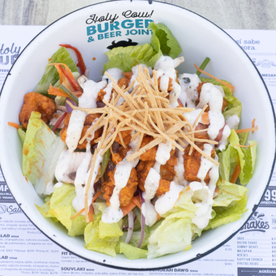 100gr. Boneless buffalo, lechuga sucrine, champiñon, tomate, zanahoria y cebolla moradafileteadas, pimiento, pepino, frituta de tortilla y aderezo ranch.