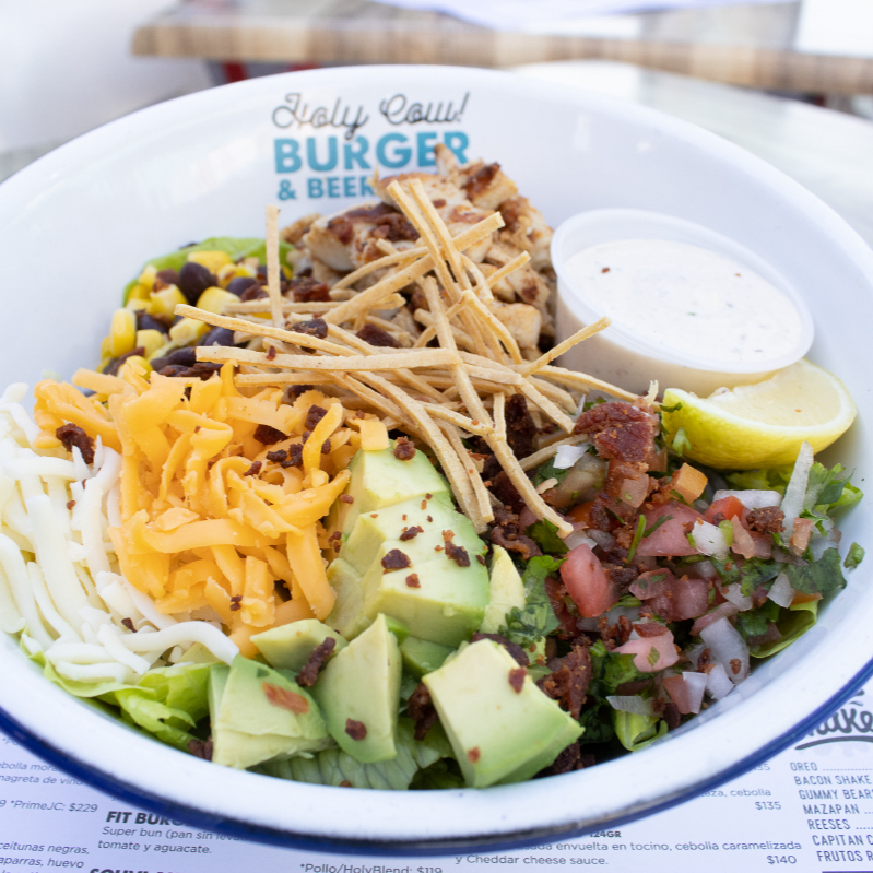 125gr. Pollo, lechuga sucrine, salsa bandera, frijol negro, elote, aguacate, queso Mty Jack, queso cheddar, fritura de tortilla, tocino picado, limón real y aderezo ranch.