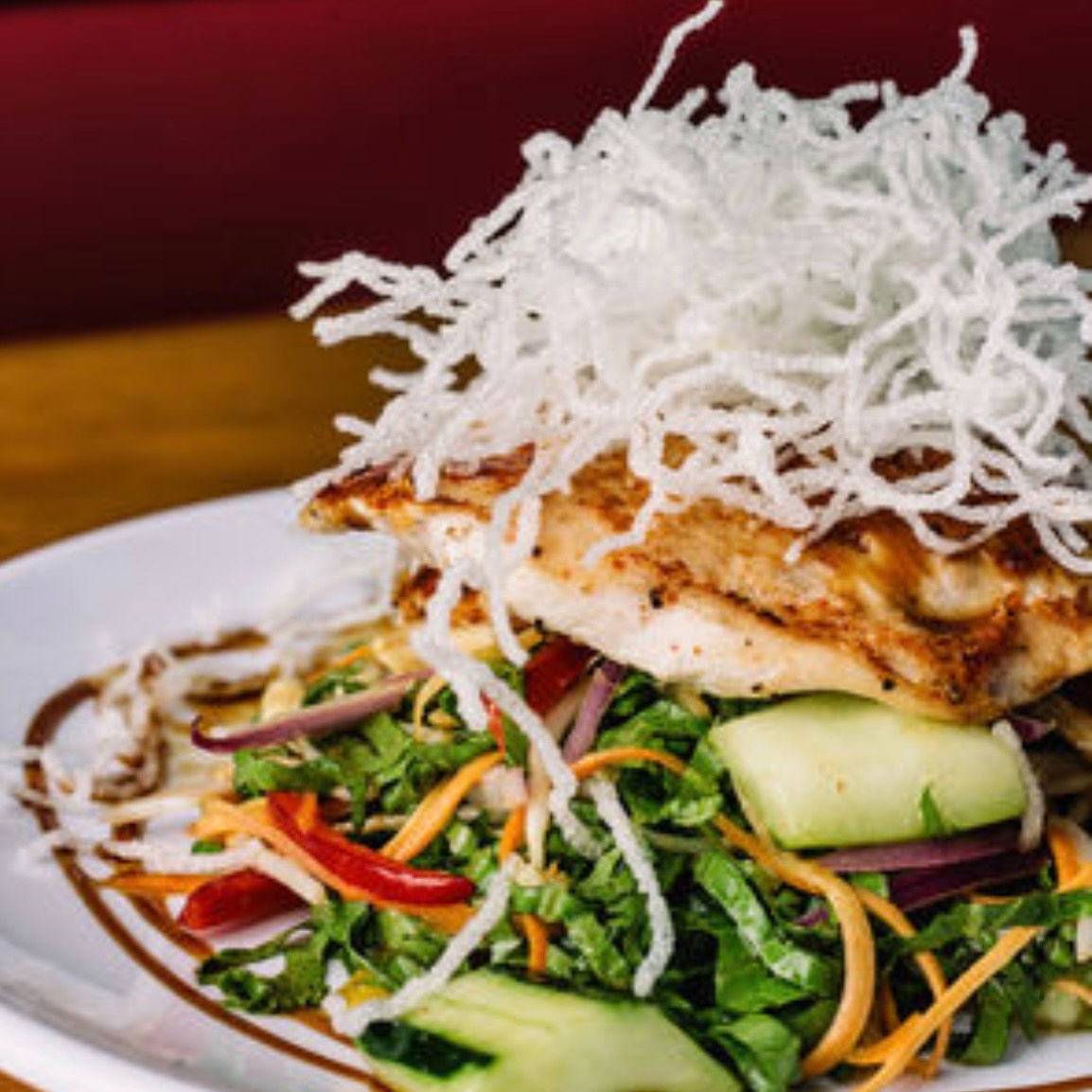 125gr. Pollo, lechuga, cebolla morada, pimientos, vermicelli, zanahoria, germen de soya, pepino, cacahuate, salsa Teriyaki y vinagreta de ajonjolí.