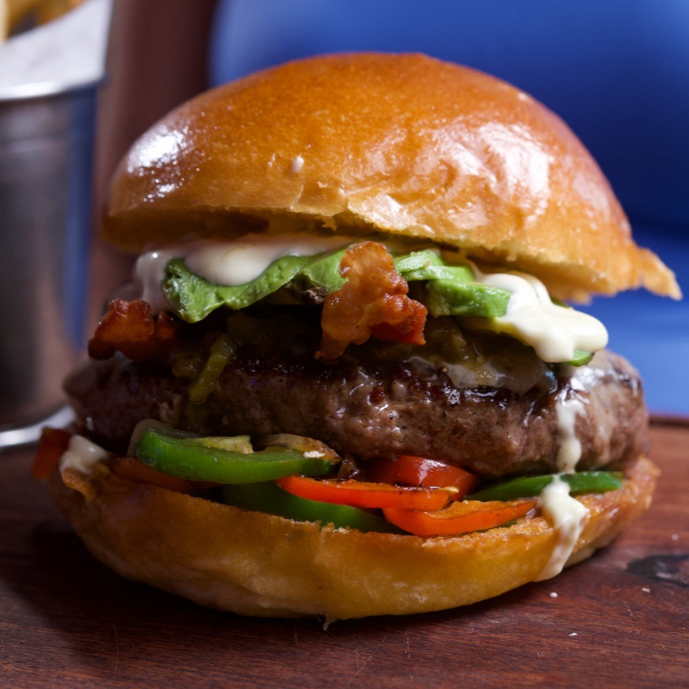180gr. Carne smash, cebolla asada, jalapeños rojos y verdes, queso Mty Jack, salsa green chile, tocino, aguacate y aderezo mayo-piquín.