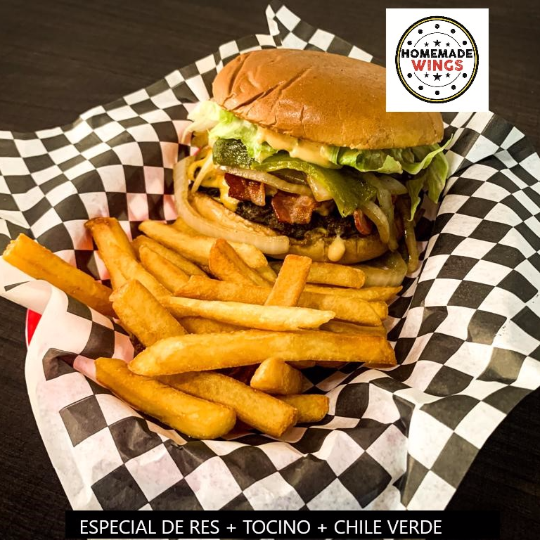 150gr de carne Res, pan brioche, Tocino, Chile verde, queso americano, aderezo Homemade, cebollas salteadas, tomate y lechuga. Acompañala con papas francesas
