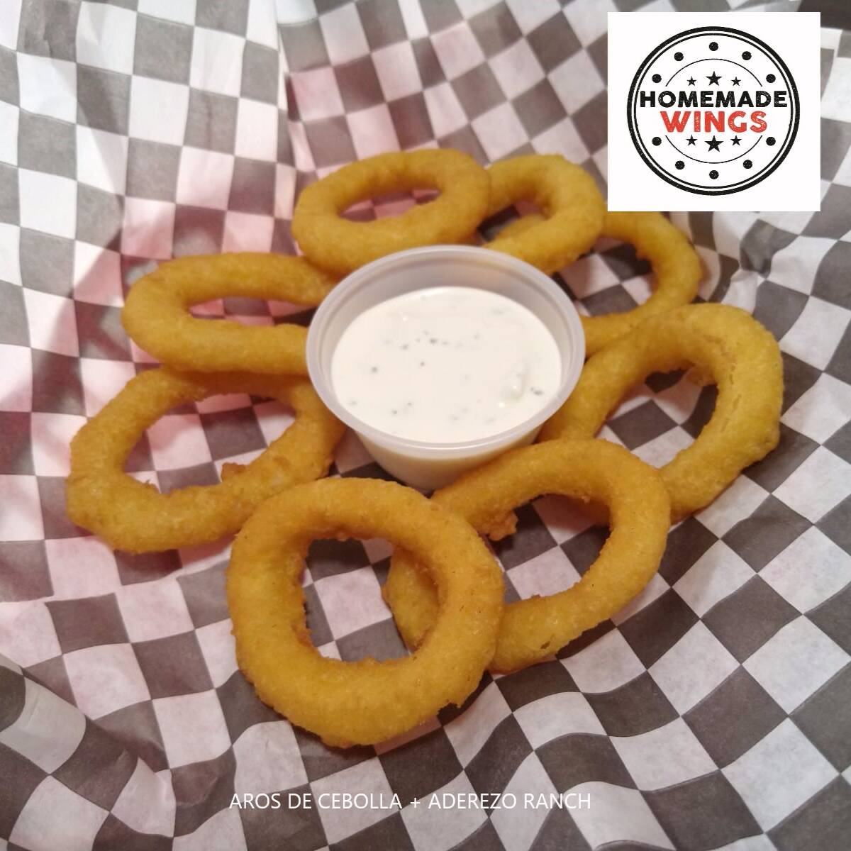 8 piezas de aros de cebolla empanizados, incluye aderezo ranch.
