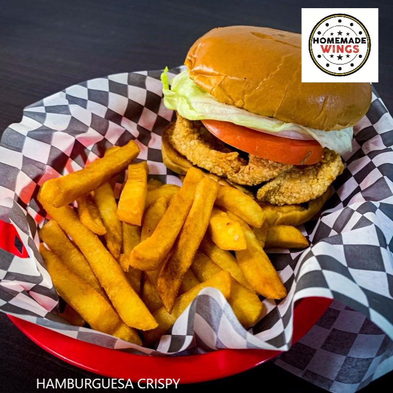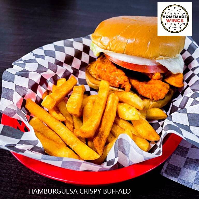 Tiras Boneless con la salsa de tu preferencia, pan brioche, tomate, lechuga, cebolla. Acompañala con papas francesas