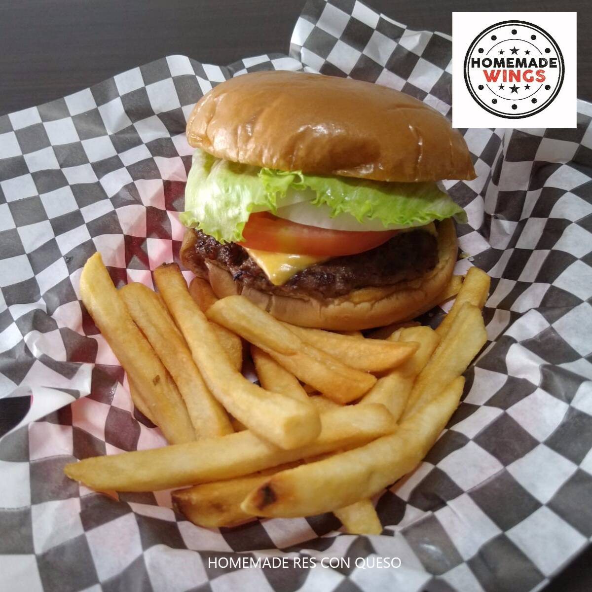 150gr de carne Res, pan brioche, queso americano, salsa Homemade, cebollas salteadas, tomate y lechuga. Acompañala con papas francesas