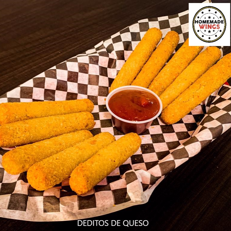 10 piezas de deditos de queso Mozzarella empanizados acompañados con salsa tipo Ragu