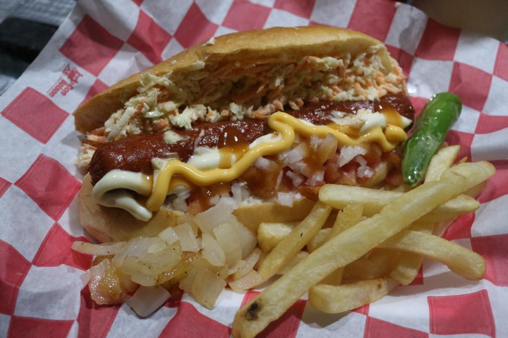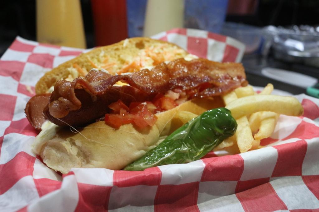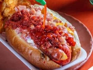 WINI DE PAVO, QUESO AMARILLO EN UN CHILE VERDE ENVUELTO EN JAMÓN Y TOCINO, TOMATE, MAYONESA, CEBOLLA ASADA Y CEBOLLA CRUDA MORADA