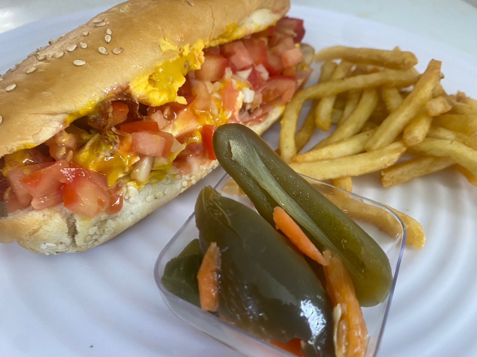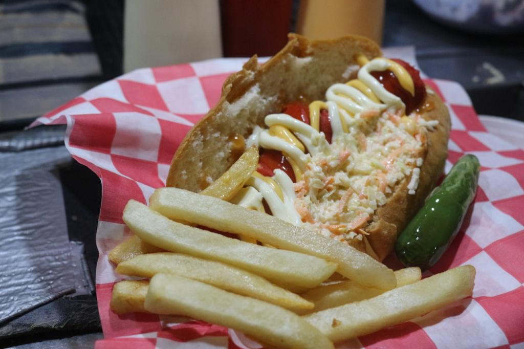 WINI DE PAVO, QUESO AMARILLO ENVUELTO EN JAMÓN Y TOCINO, TOMATE, MAYONESA, CEBOLLA ASADA Y CEBOLLA CRUDA MORADA