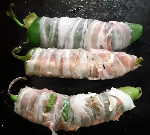 WINI DE PAVO, QUESO AMARILLO EN UN CHILE VERDE ENVUELTO EN JAMÓN, TORTILLA DE HARINA Y TOCINO