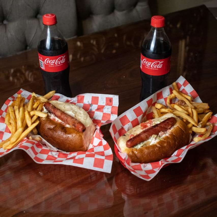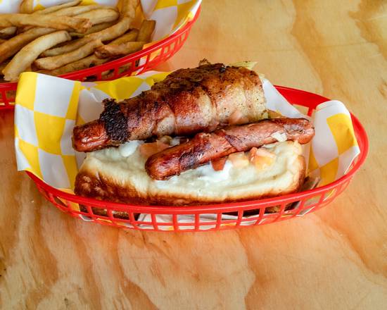 2 Salchichas Rosarito envuelta con tocino, frijoles, cebolla asada, lechuga, tomate y mayonesa.
