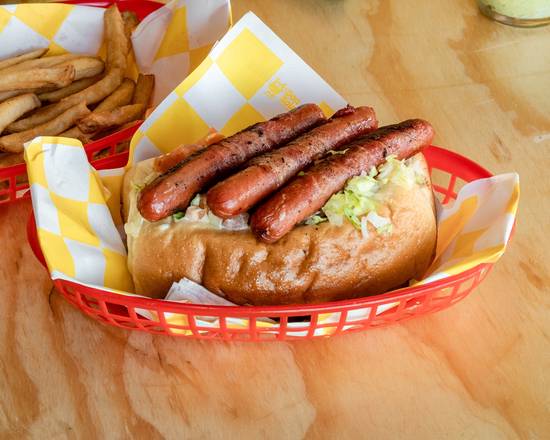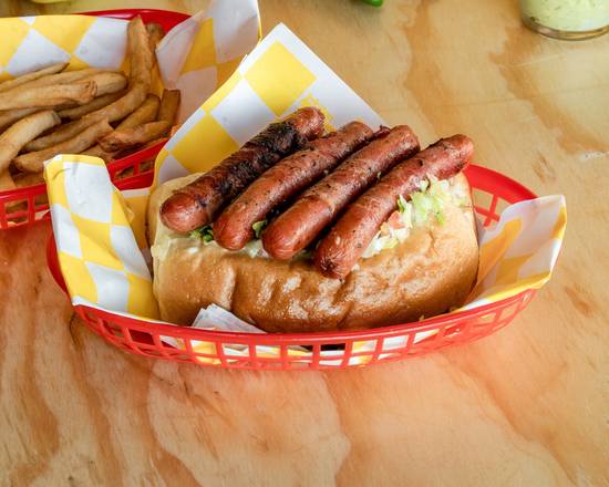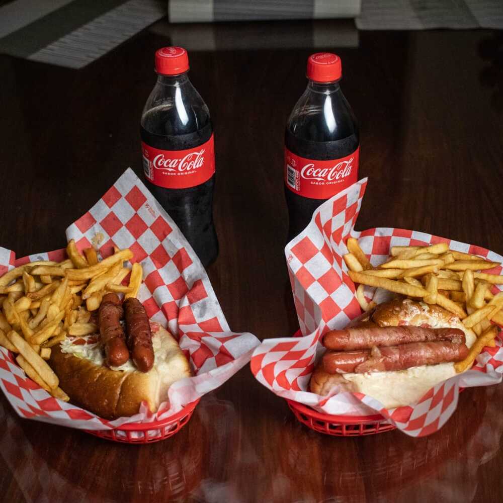 4 Salchichas Rosarito enrolladas en tocino, frijol, cebolla asada, lechuga, tomate y mayonesa.