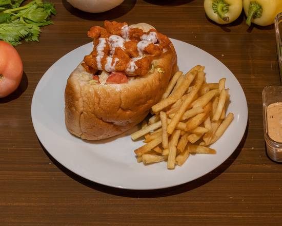 Pollo empanizado bañado en salsa a elegir. Salchicha Rosarito enrollada en tocino, frijol, cebolla asada, lechuga, tomate y mayonesa.