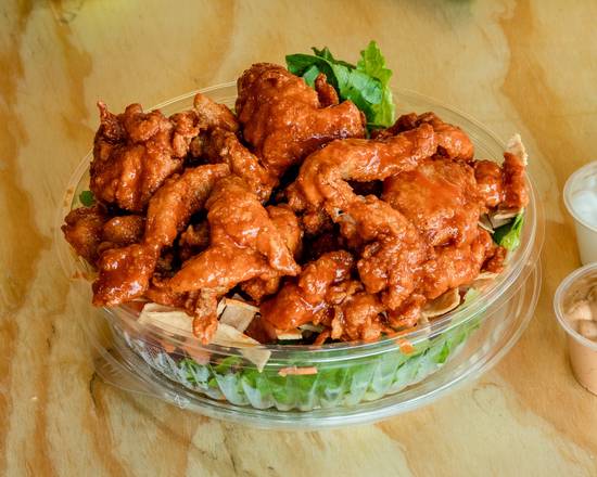 Lechuga orejona, col morada, zanahoria, pepino, tomate y fritura. Pechuga de pollo empanizada, salsa a elegir y aderezo ranch.
