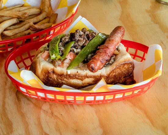 Carne adobada, salchicha rosarito envuelta en tocino, queso gratinado chihuahua, frijol, cebolla asada, lechuga, tomate y mayonesa.