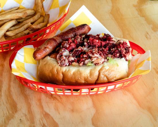 Salchicha de pavo jumbo especial enrollado con tocino y queso chihuahua y salchicha Rosarito, frijol, cebolla asada, lechuga, tomate y mayonesa.