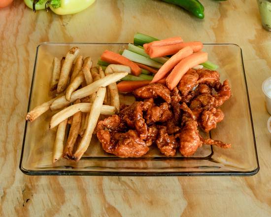 Tiras de pechuga de pollo empanizada, salsa a elegir, con tiras de apio y zanahoria, 2 aderezos (chipotle y aderezo boneless)