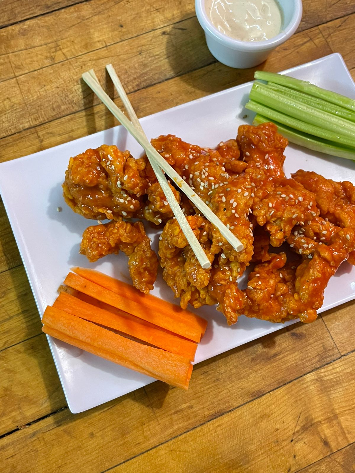 Boneless en salsa de tu preferencia acompañados de zanahoria, apio y aderezo ranch