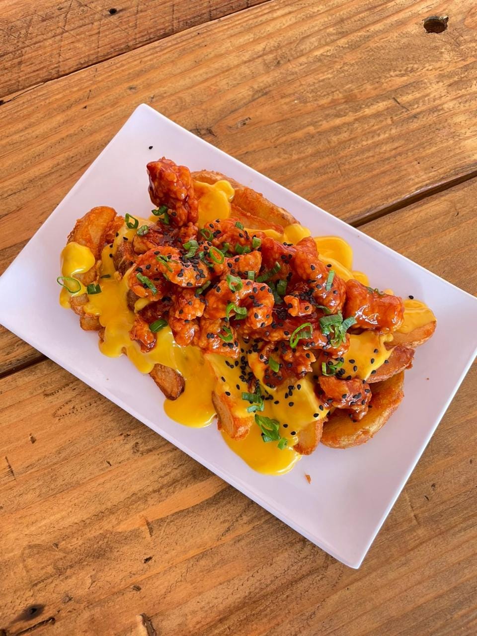 300gr de papas sazonadas, queso amarillo caliente y 100gr de boneless en salsa de tu elección.