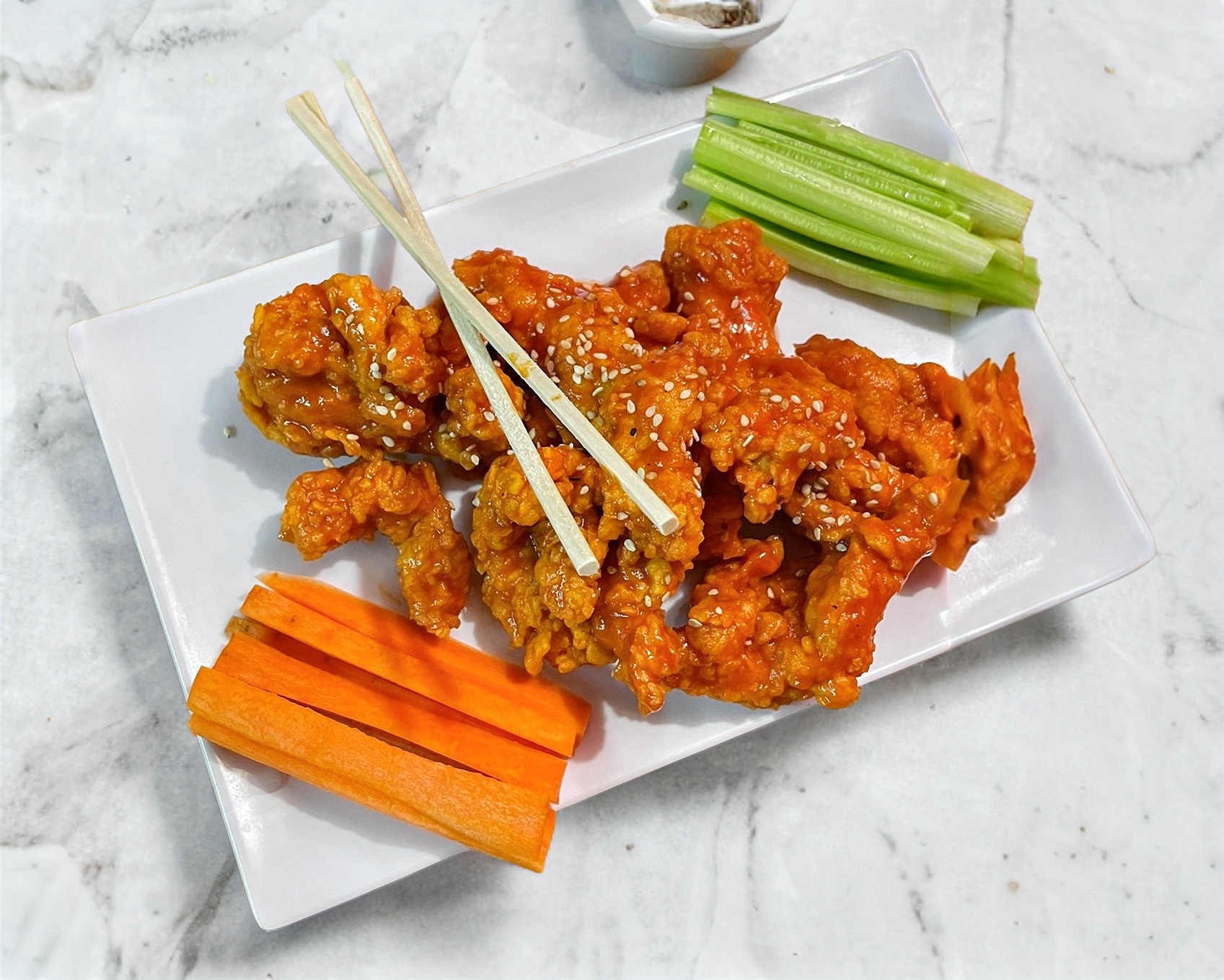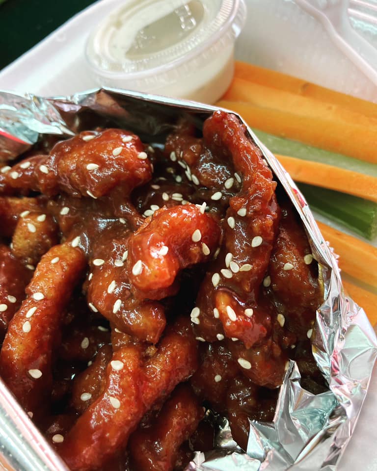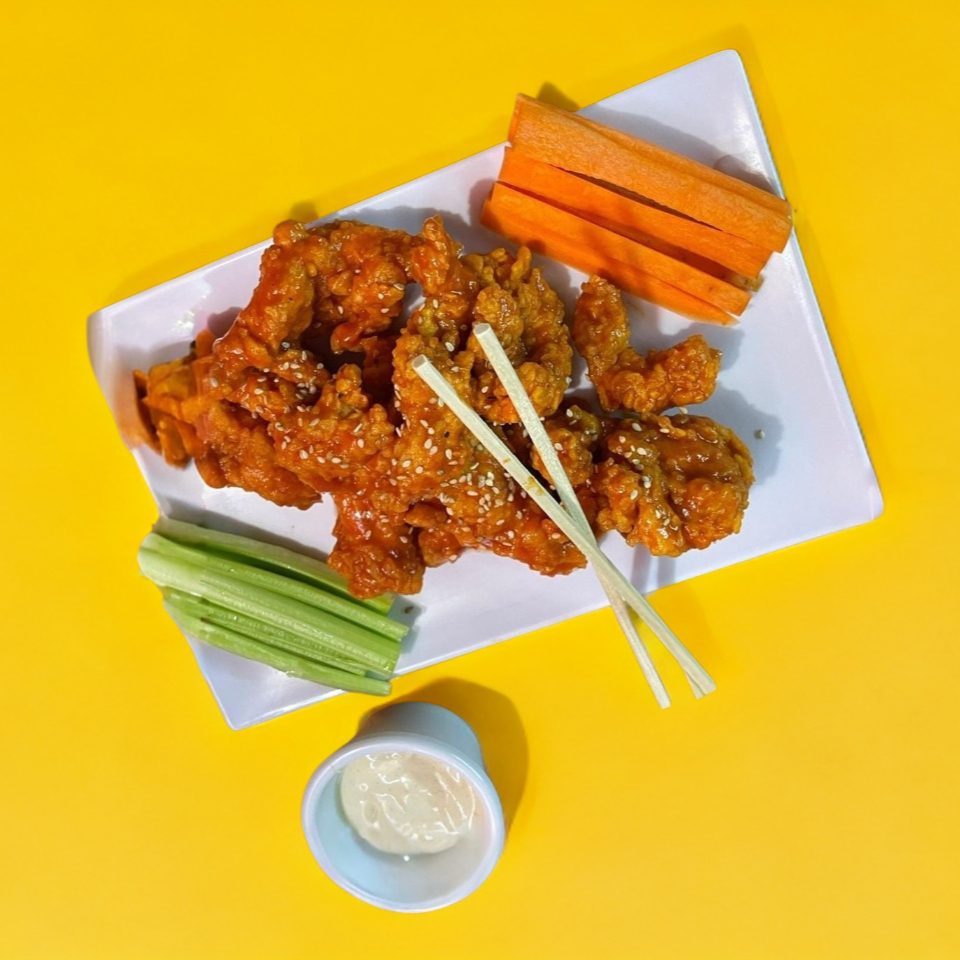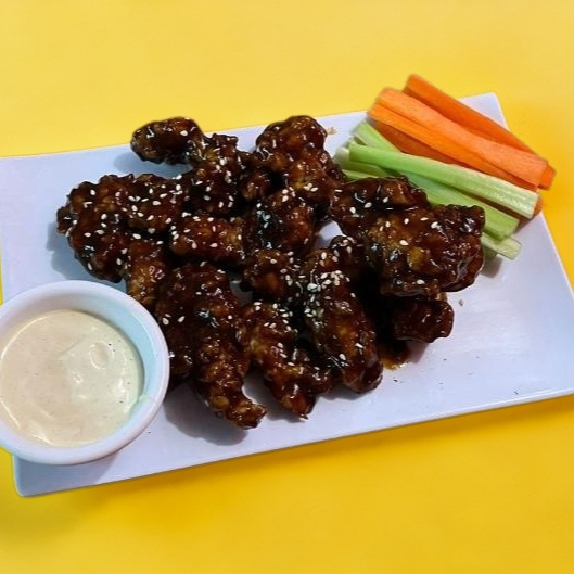 Boneless acompañados de zanahoria, apio y aderezo ranch