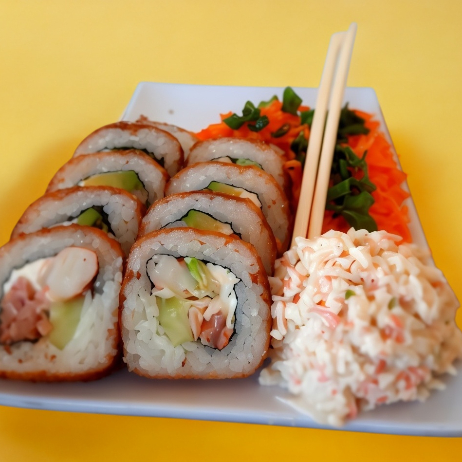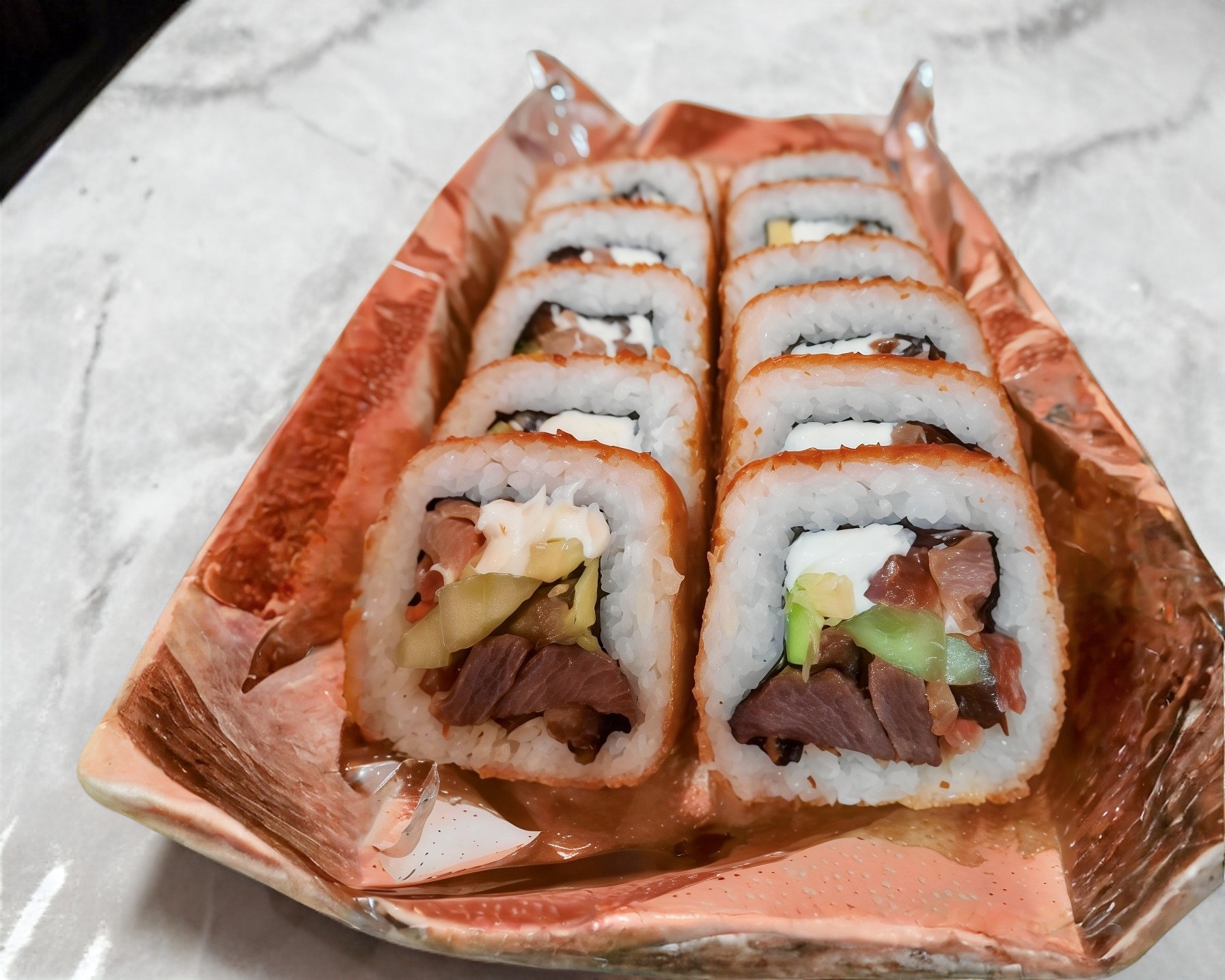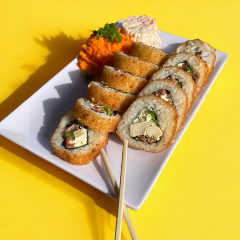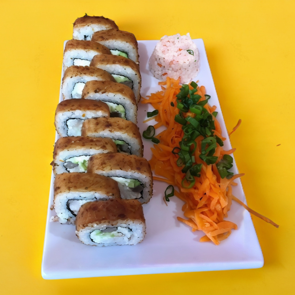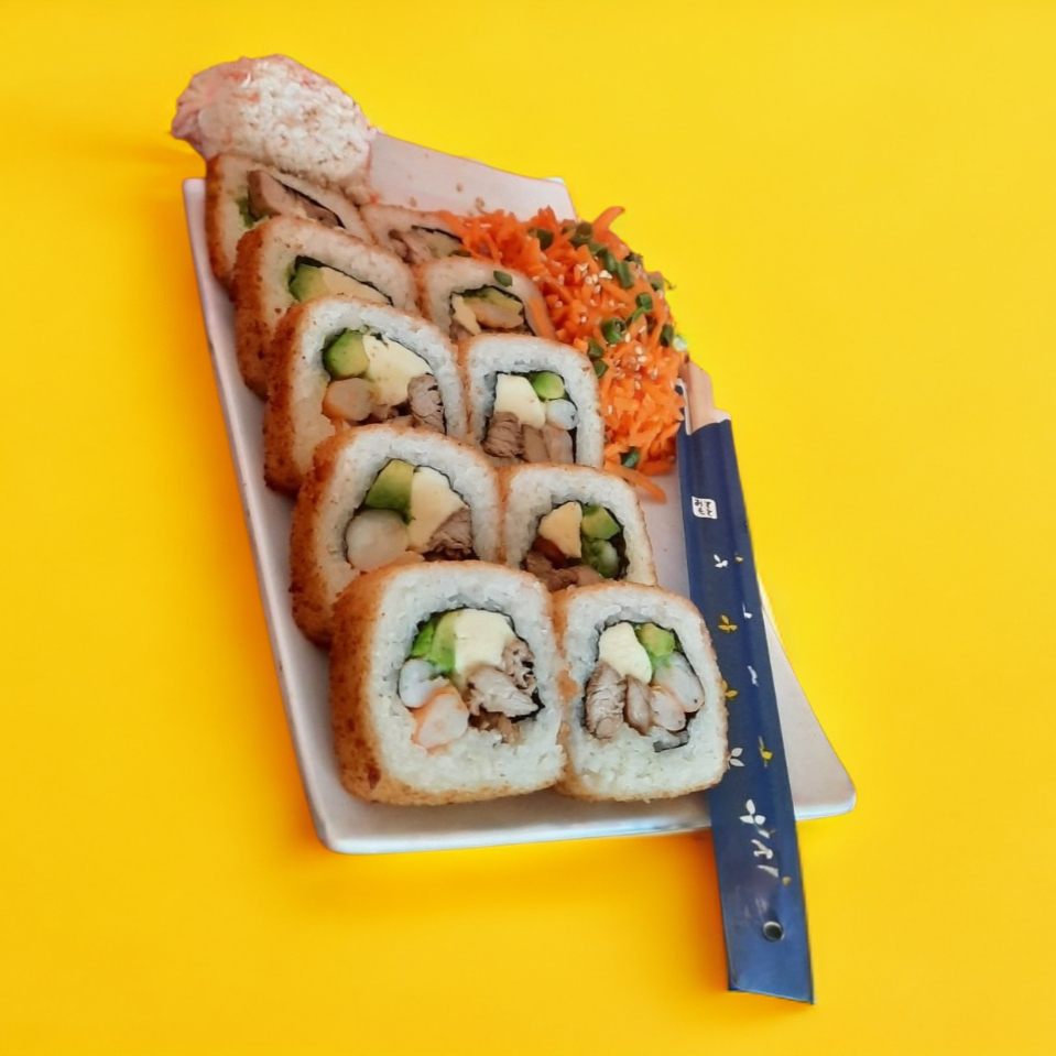 Philadelphia, aguacate, pepino, camarón y tocino.