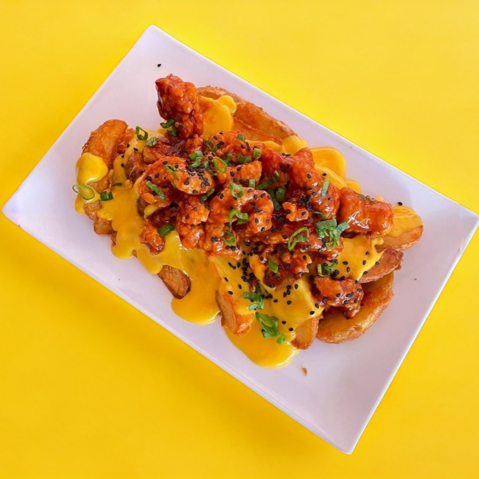 300gr de papas sazonadas, queso amarillo caliente y 100gr de boneless en salsa de tu elección.