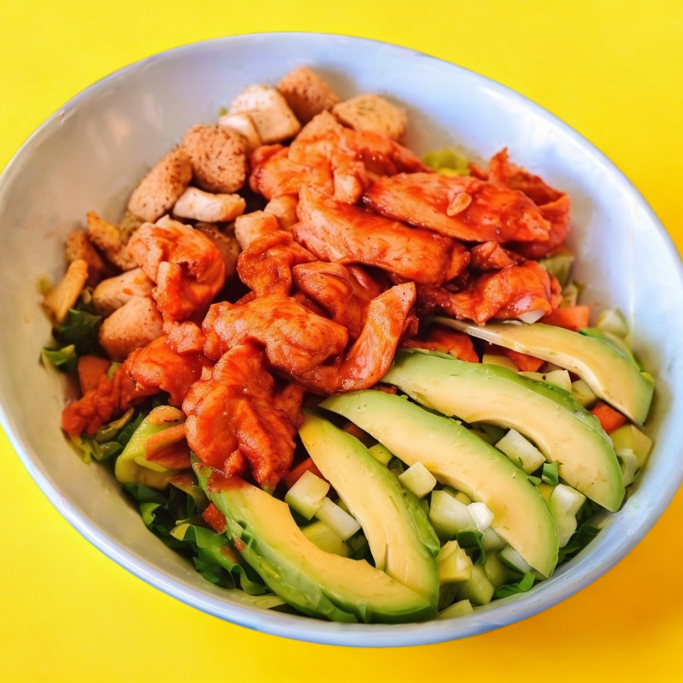 Arroz, pollo sazonado, aguacate y filadelfia.