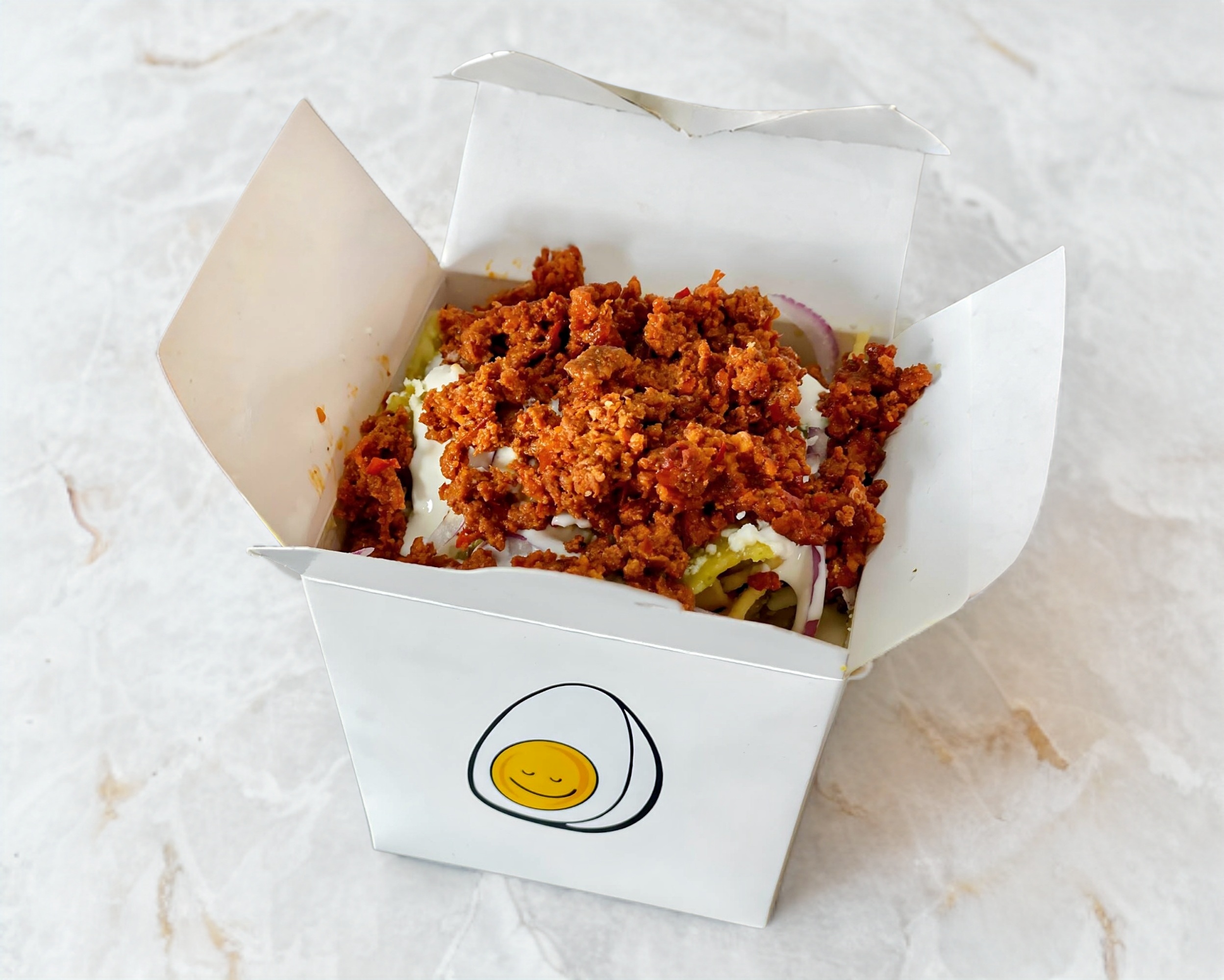 Pan brioche, mayonesa chipotle, papa hash brown, huevo estrellado o revuelto con tocino y queso manchego.