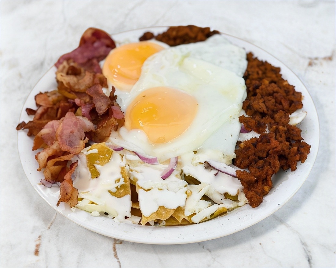 Orden grande de chilaquiles verdes con cebolla, queso y crema, acompañados de dos huevos estrellados, tocino y chorizo.
