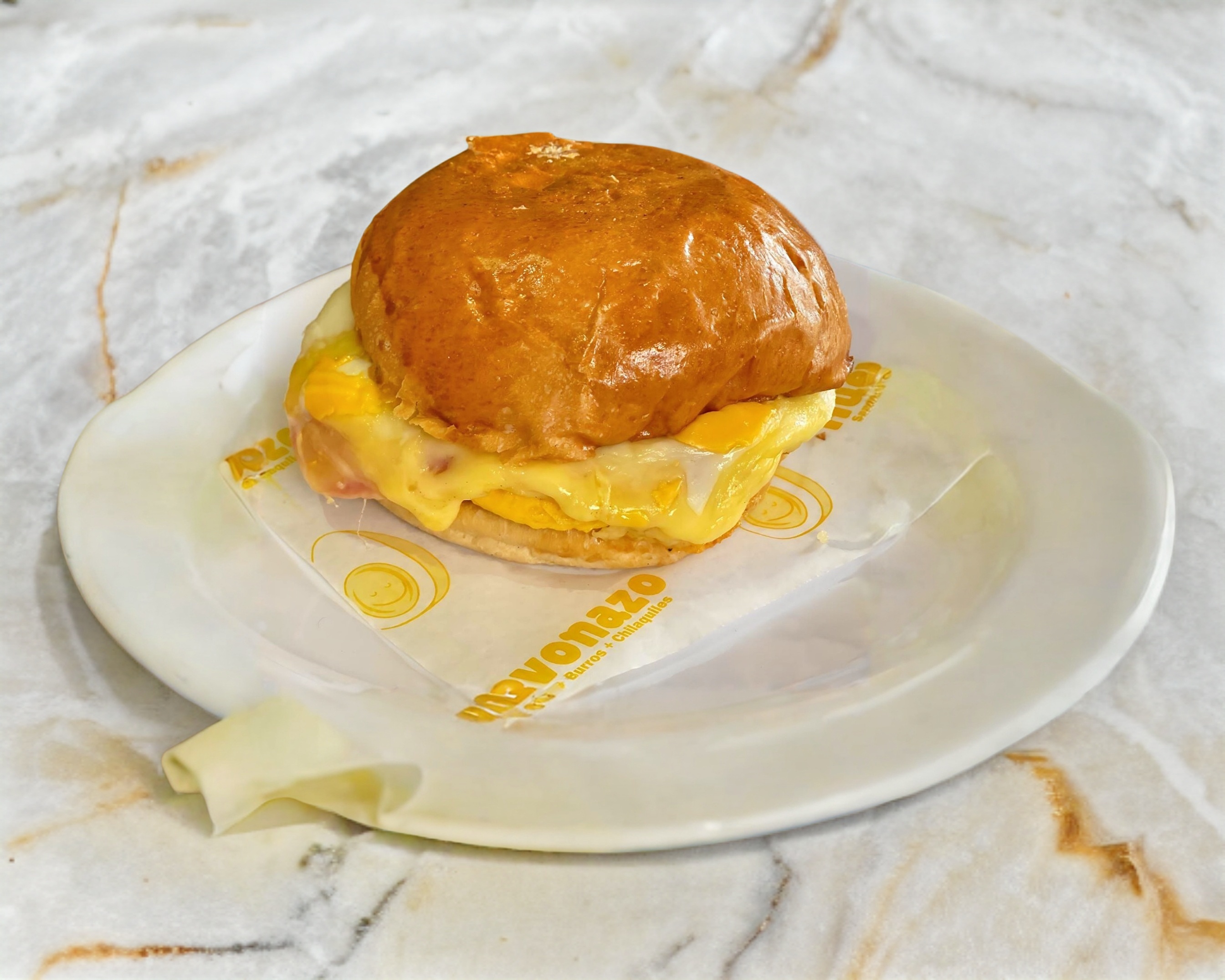 Pan brioche, mayonesa chipotle, cebolla caramelizada, huevo estrellado o revuelto con tocino, jamón, salchicha y queso manchego.