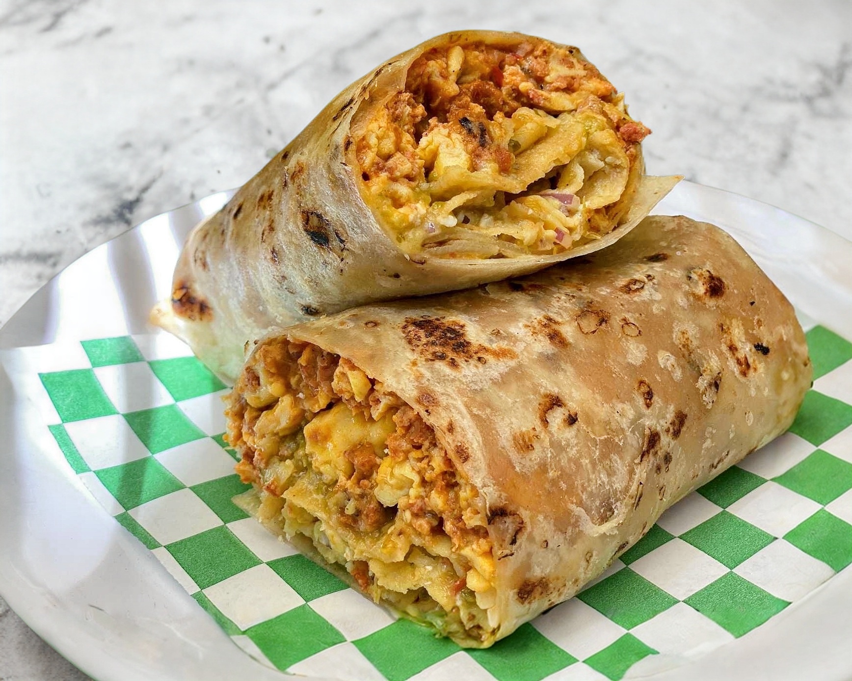 Tortilla de harina 40 cm, frijoles puercos, huevo revuelto con chorizo y chilaquiles verdes con queso, crema y cebolla.