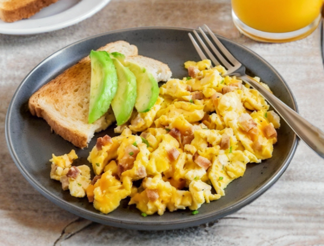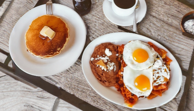 2 huevos al gusto, porción de chilaquiles, frijoles refritos y 2 piezas de hot cakes.