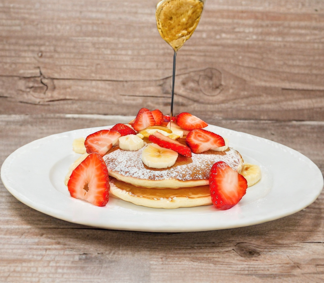 3 Hot Cakes bañados con salsa de fresa de casa y rebanadas de platano. Servidos con miel maple