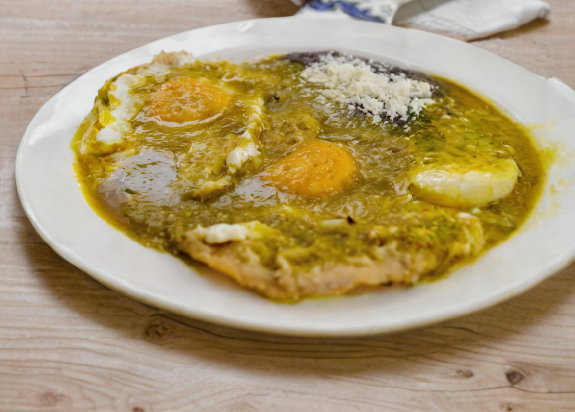 Cama de tortilla de maíz con frijoles refritos y jamón, bañados en salsa verde con queso Cotija espolvoreado.
