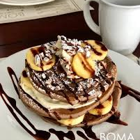 3 Hot Cakes bañados en salsa de chocolate de la casa y rebanadas de platano. Servidos con miel maple