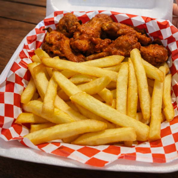 400 g de alitas bañadas en salsa a elegir, acompañadas con 200 g de papas a la francesa.