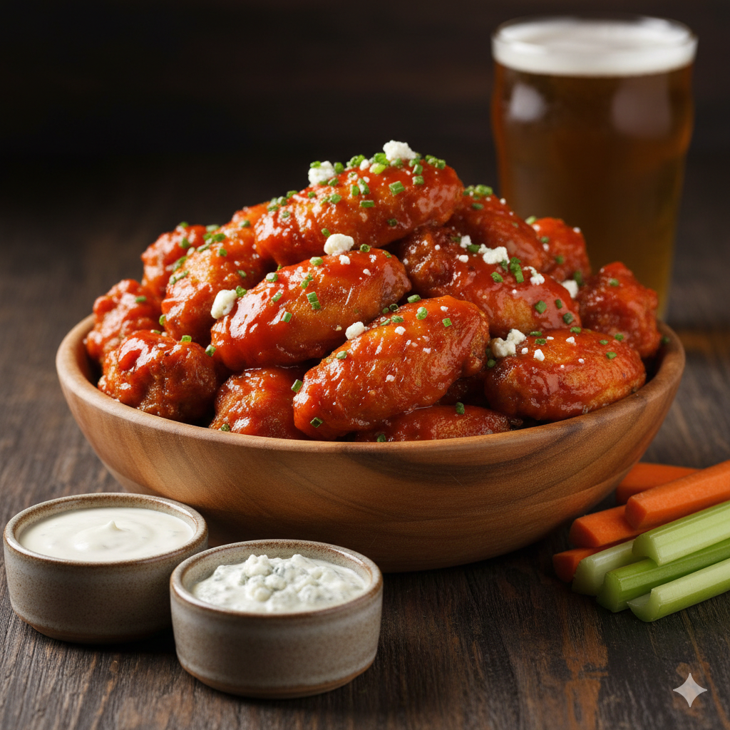 Pollo empanizado en la salsa de tu elección, incluye aderezo ranch, apio y zanahoria.
