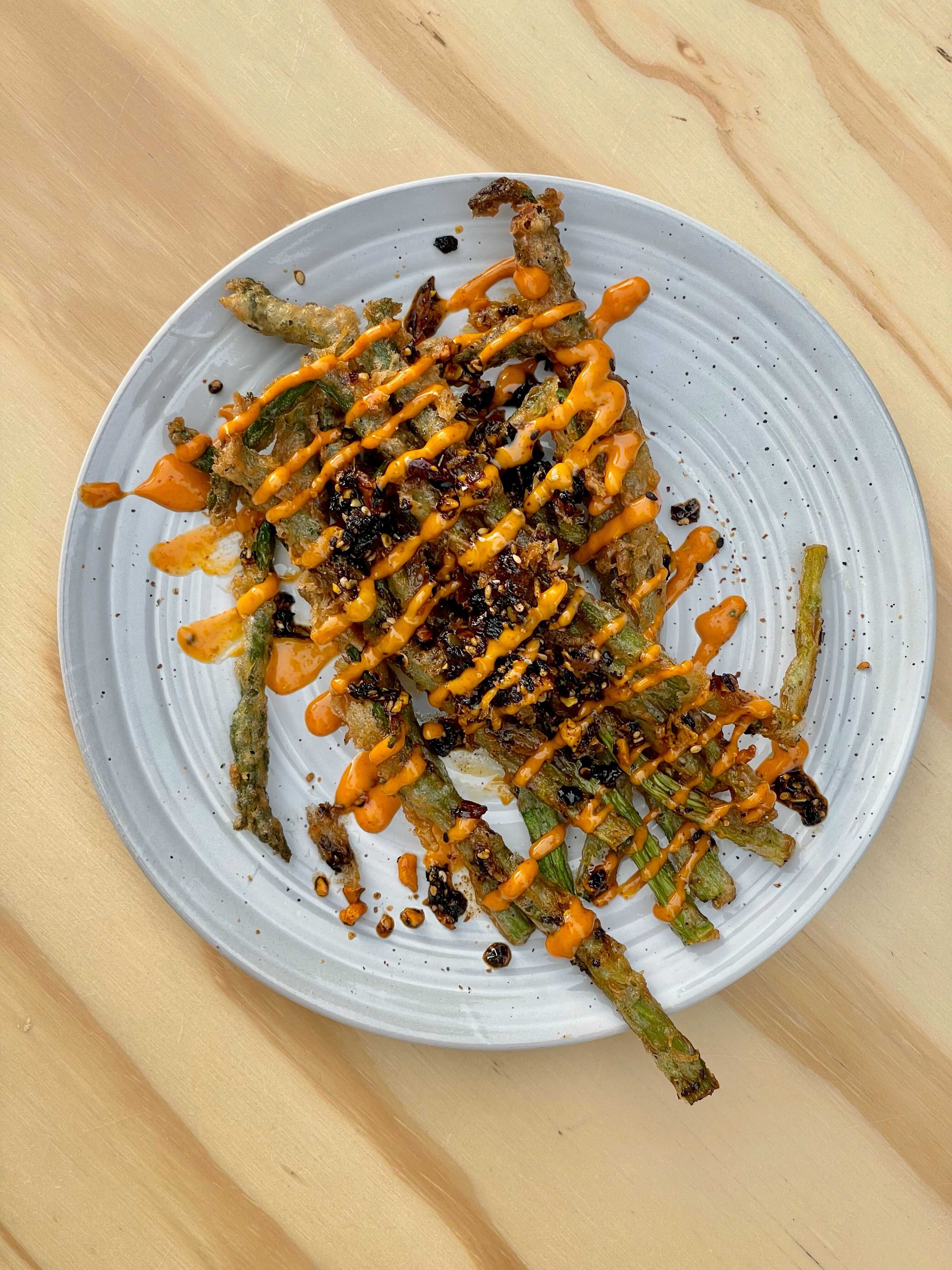 Arroz gohan, salmón, salsa macha, espárrago en tempura, aguacate, furikake, pepino, cebolla.