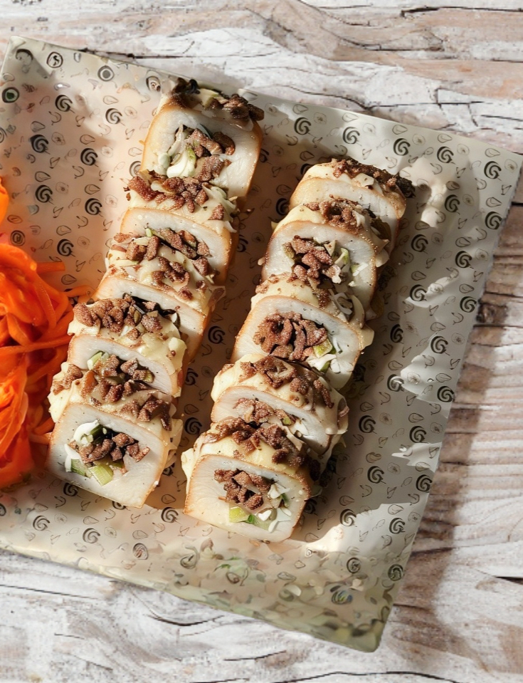Lomo de cerdo empanizado, queso crema, pepino, aguacate, napa, salsa tonkatsu, cebollín.