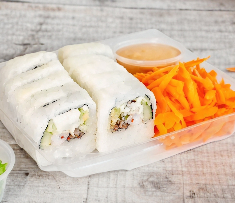 Arroz gohan, camarón, pepino, mango, aguacate y chile en polvo.