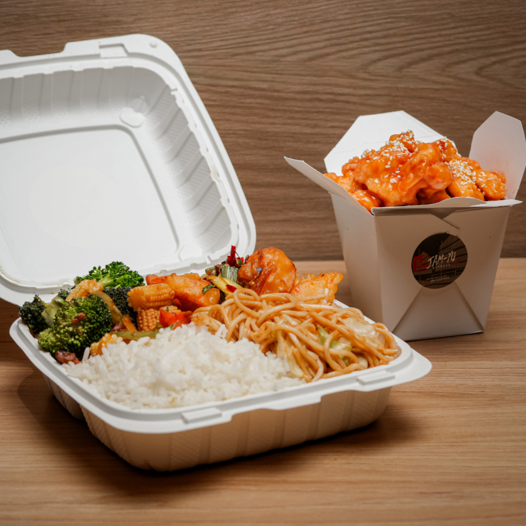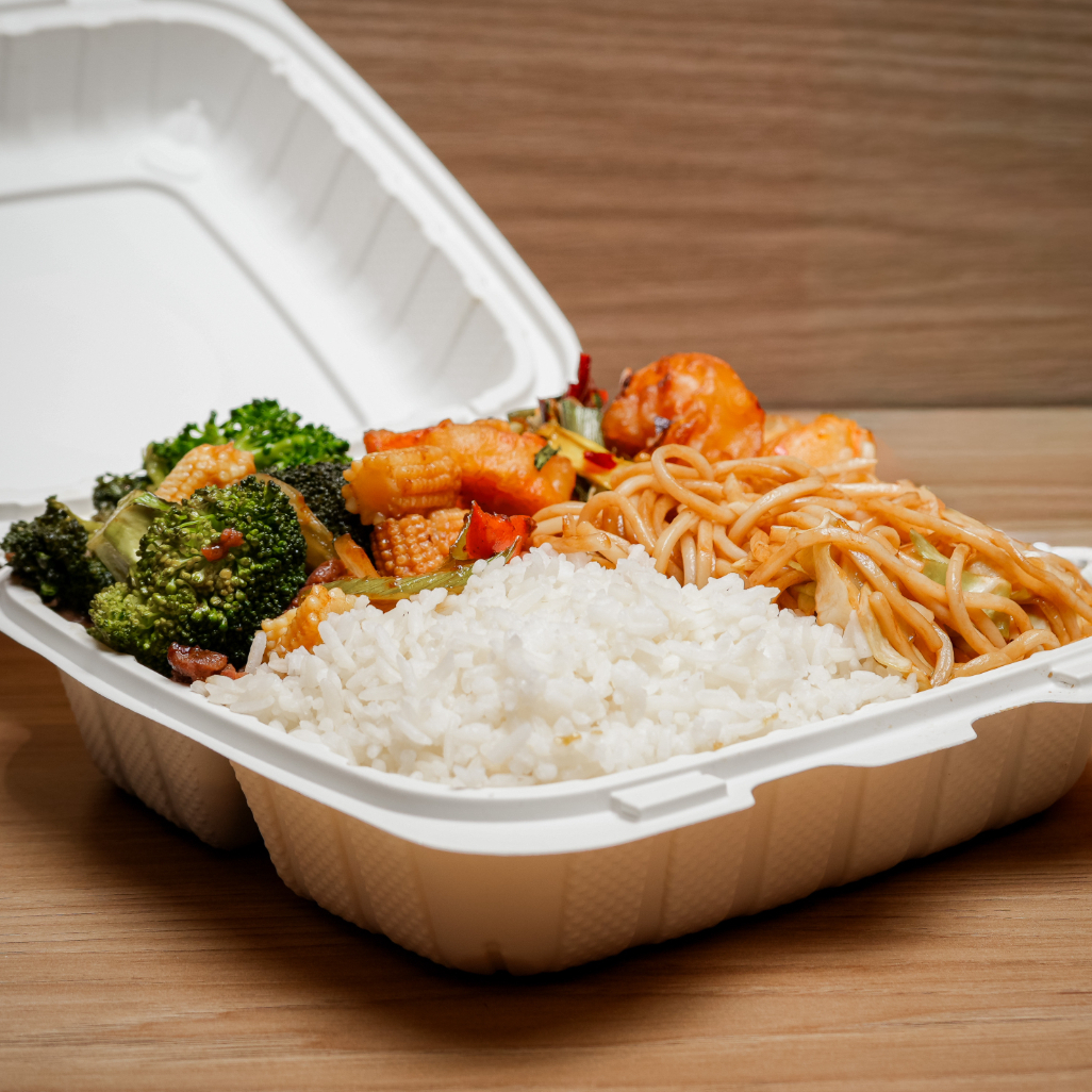 Elige una base (arroz frito, arroz blanco o chow mein) y acompáñala con una porción de tu guiso favorito. Perfecto para un antojo rápido y lleno de sabor.