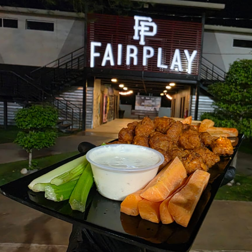 700gr de deliciosas y carnosas alitas de pollo, bañadas en tu salsa favorita, acompañadas de frescos bastones de Zanahoria y Apio, papas fritas y un rico aderezo Ranch de la casa
