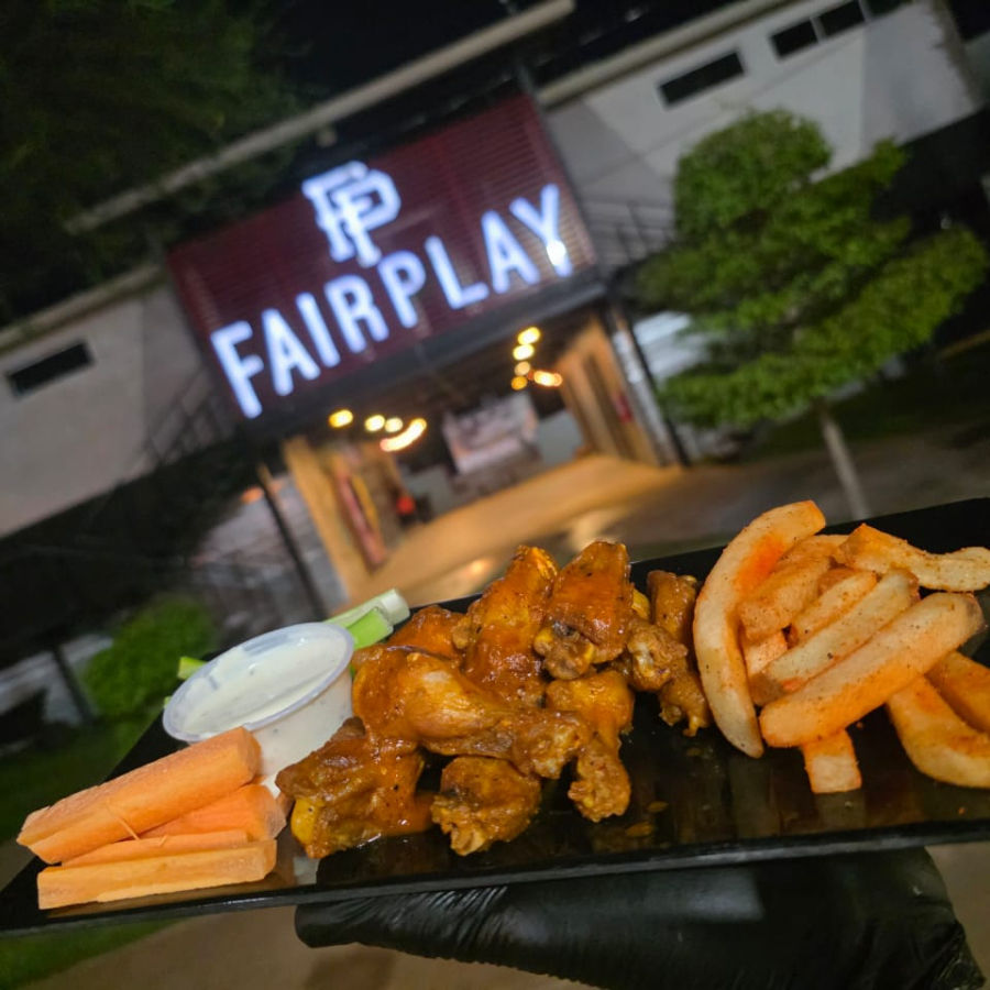 eliciosos trozos de pollo (240gr) en la salsa de tu elección, acompañadas de frescos Bastones de Zanahoria y Apio, papas fritas y aderezo Ranch de la Casa