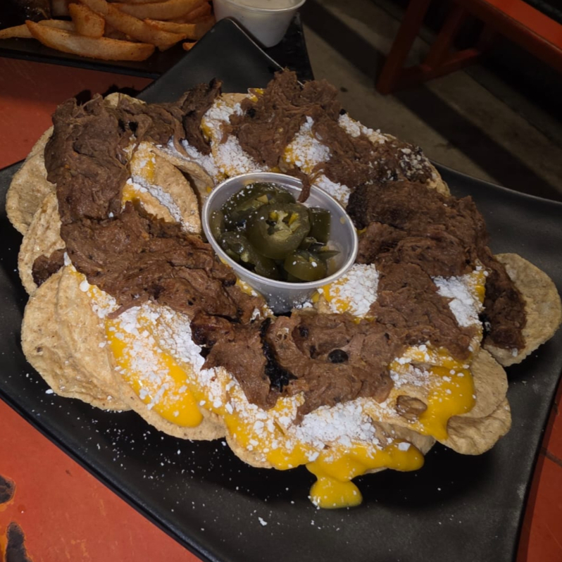 Crujientes totopos redondos bañados de queso cheddar liquido, queso blanco y jugosa carde de res (100gr), acompañados de chiles jalapeños en rodajas.