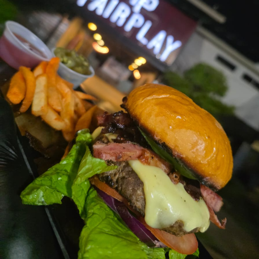 Pan Bloch, 1/2 libra (225gr) de carne 100% de res (arrachera y rib eye) preparada en casa, queso regional cocido (rayon son.), lechuga, tomate, rodajas de cebolla, aguacate, acompañada de papas fritas, con un sazon de la casa
