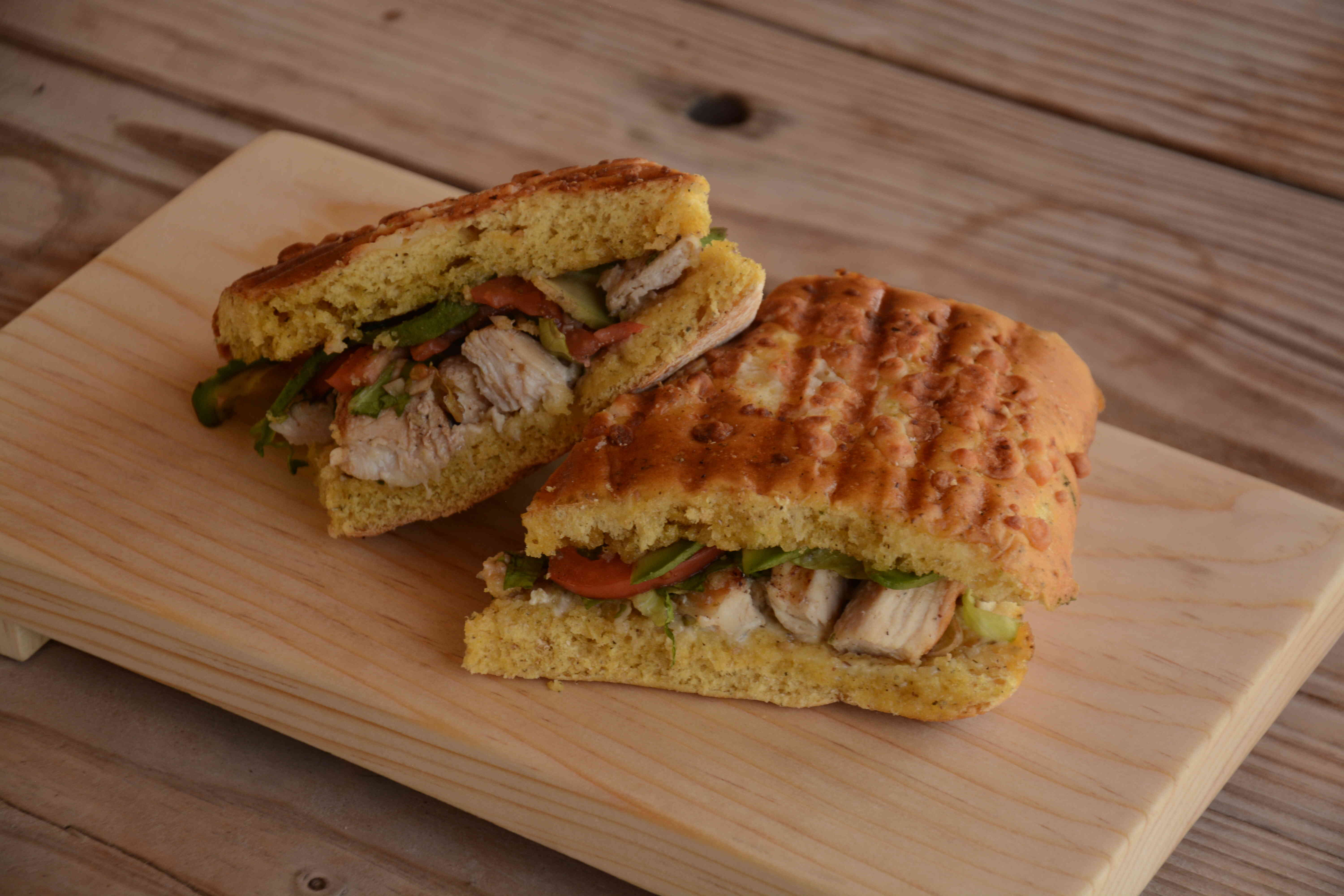 Pan de ajo, pollo, lechuga, tomate, aguacate y mayonesa especial