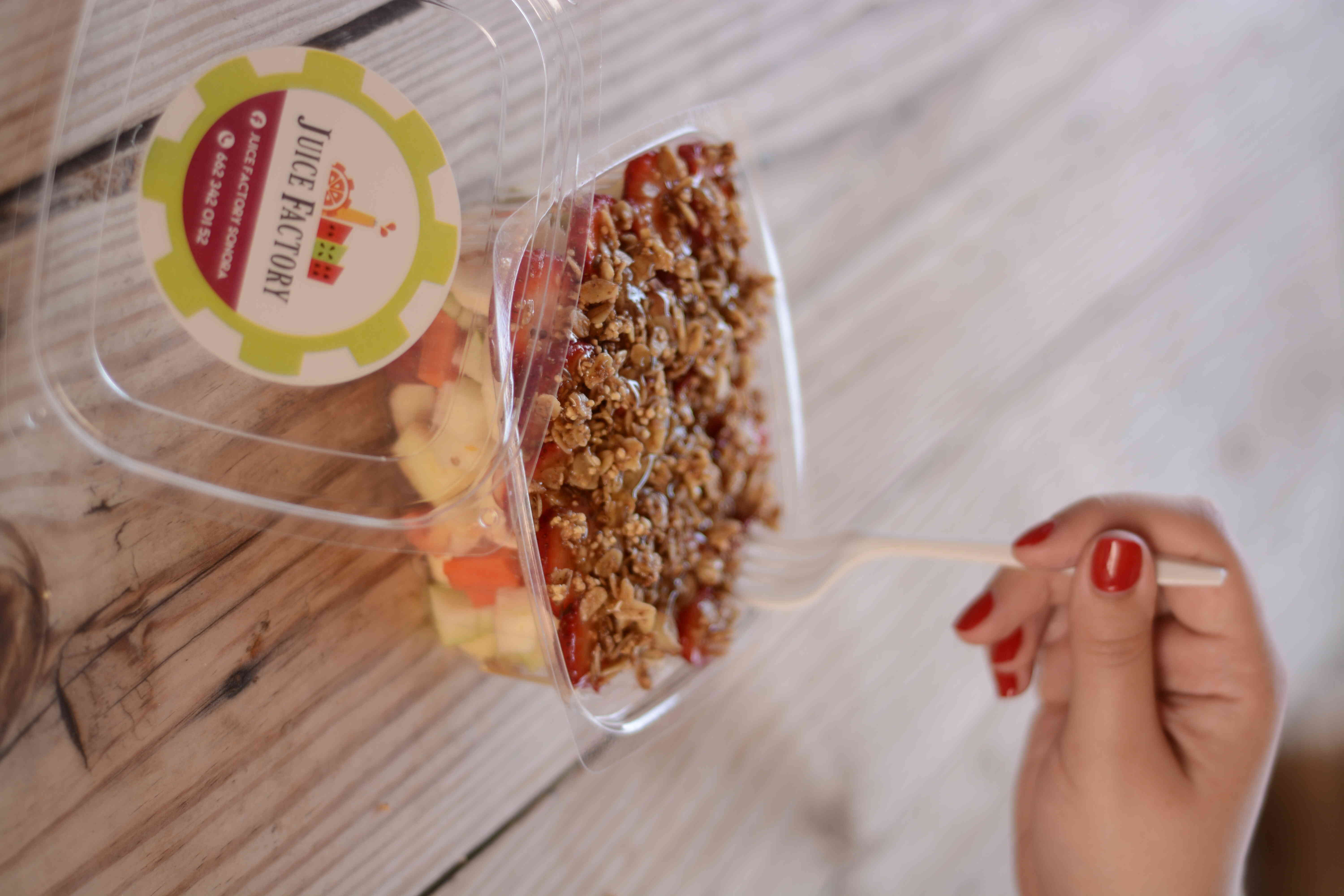 Plátano, fresa, papaya, yogurth, avena, granola, amaranto, salvado y linaza.