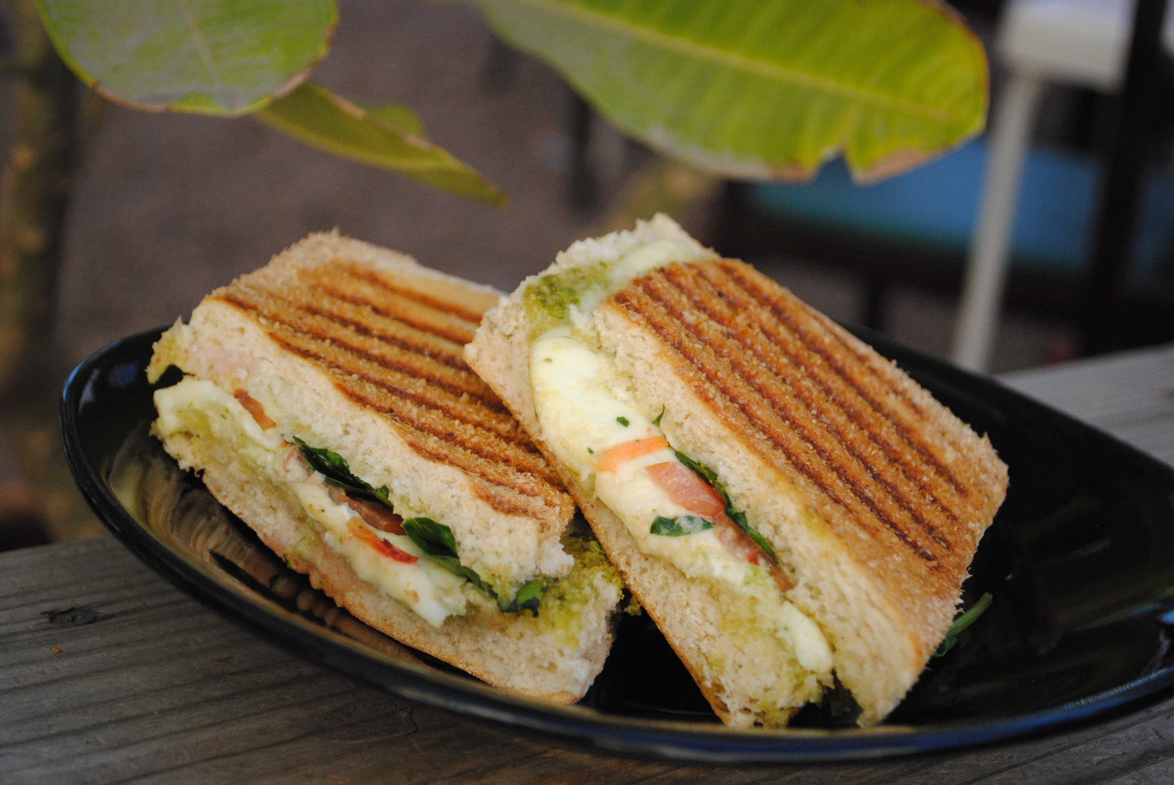 Tomate marinado, salsa pesto, espinaca y queso panela.