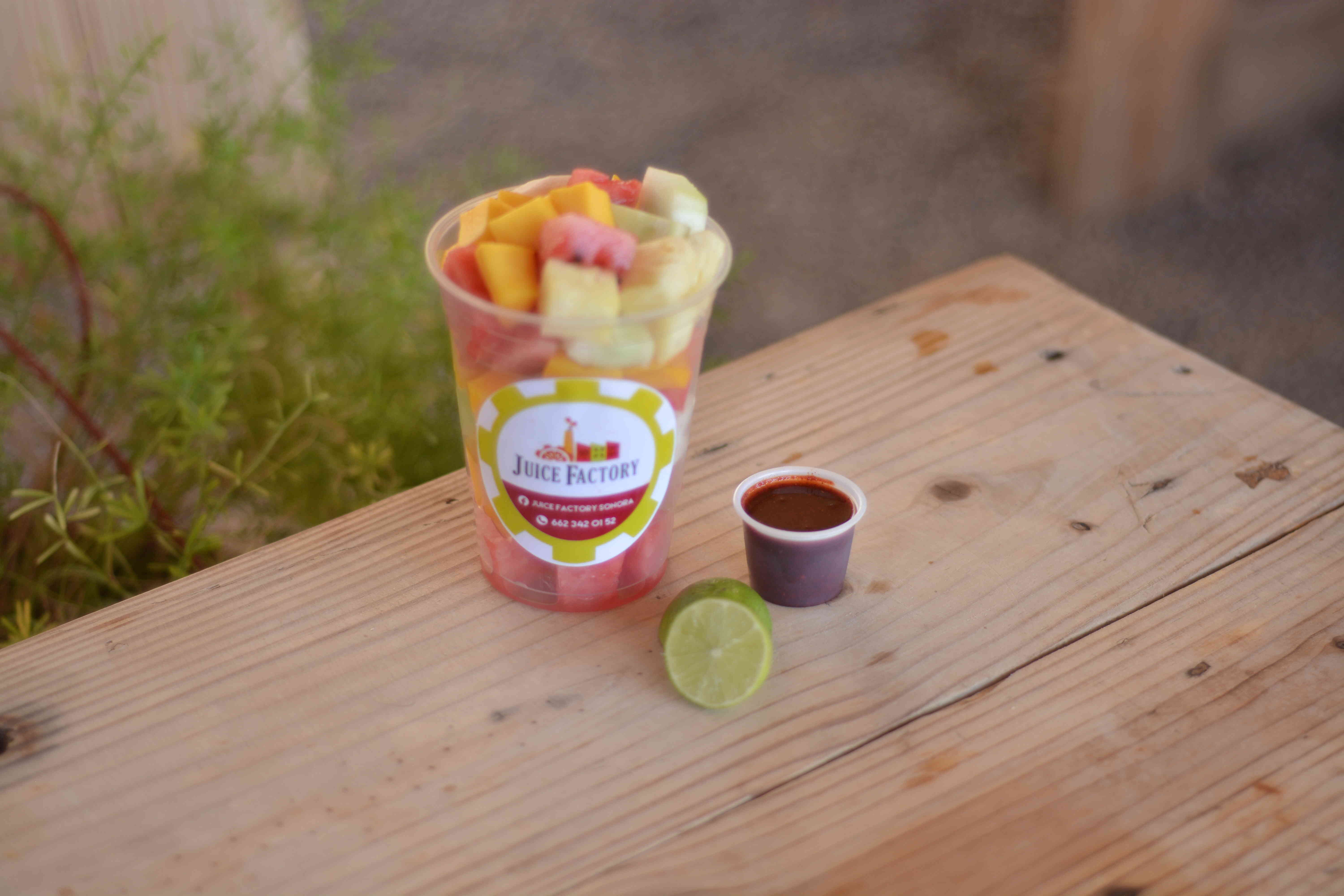 Sandía, jícama, pepino, naranja, piña, mango, limón y salsa