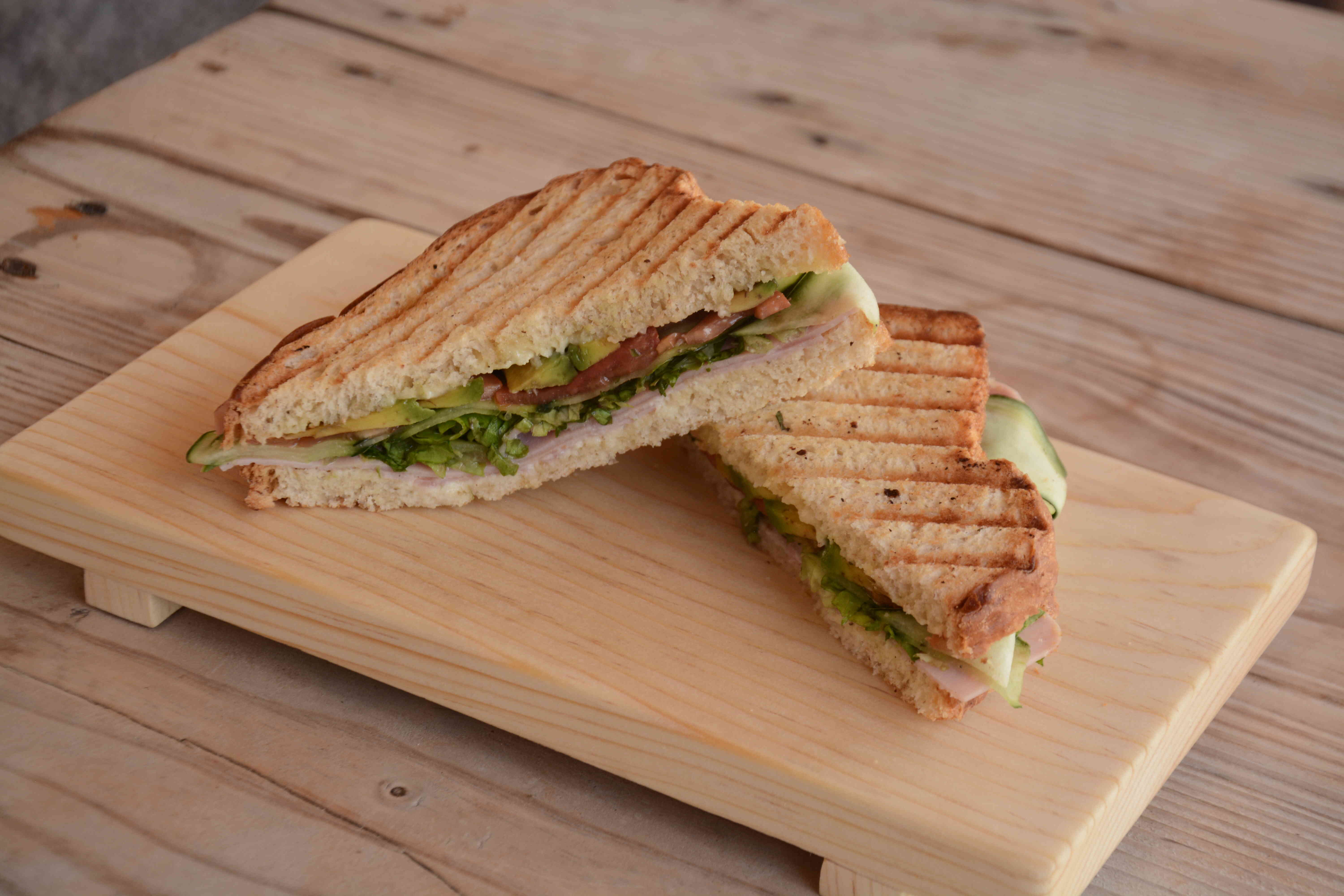 Pan blanco, jamón de pavo, pepino, tomate, aguacate y mayonesa especial