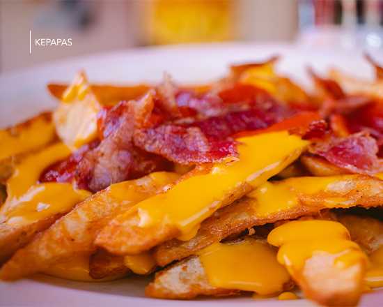 Papas sazonadas, queso amarillo, tocino y ahogo.