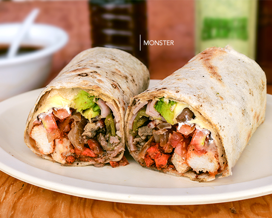 EXTRA carne a la plancha, aguacate, tocino, chile verde, frijoles, cebolla asada y EXTRA queso.
